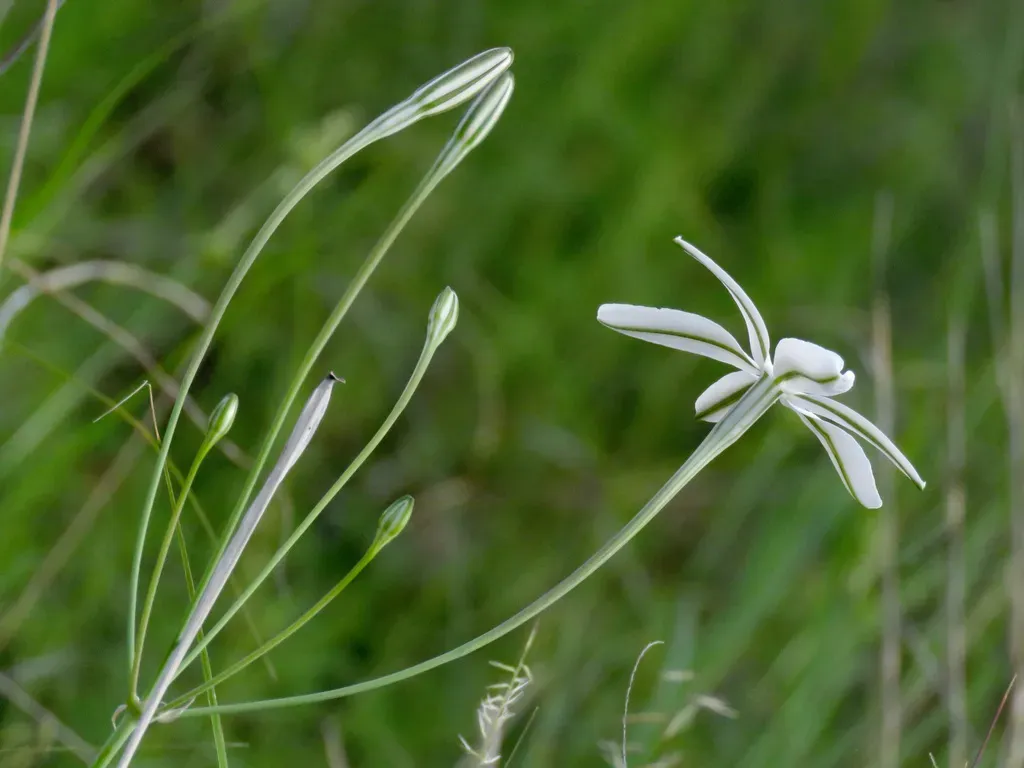 Milla biflora is a perennial bulbous plant known for its showy white flowers with a thin green midvein, native to the southwestern United States and Mexico.