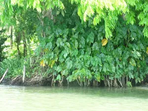 Montrichardia arborescens is a tropical aquatic herbaceous plant that grows along riverbanks, swamps, and creeks, reaching up to 3 meters tall.