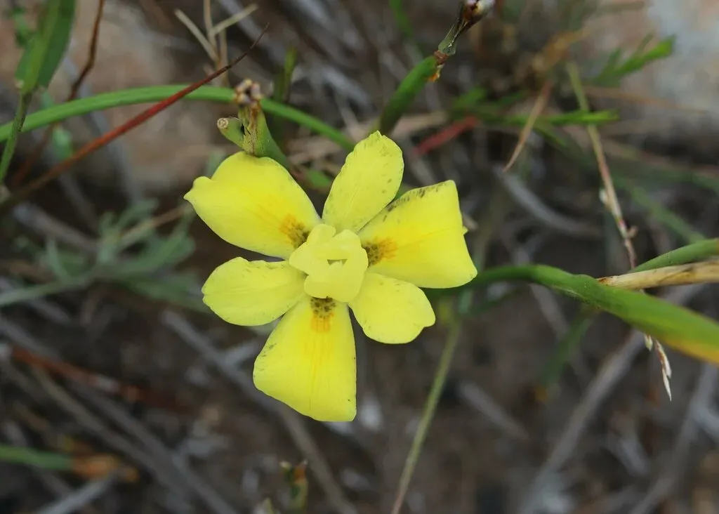 Moraea fugax is a perennial plant growing from an underground corm, reaching up to 45 cm tall, with blue and yellow flowers appearing in spring.