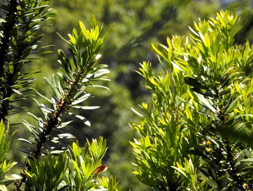 Morella californica is a broadleaf evergreen shrub or small tree native to the Pacific Coast of North America, known for its aromatic foliage and waxy berries.