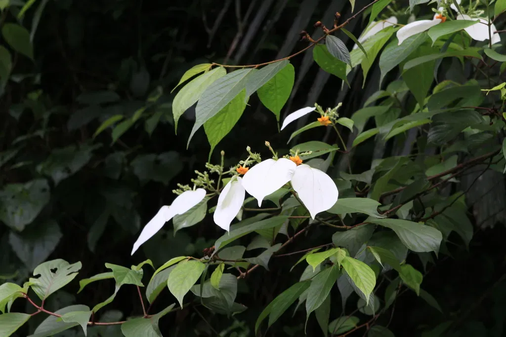 Mussaenda frondosa is a straggling, evergreen shrub in the Rubiaceae family, known for its showy white bracts and orange-yellow flowers.