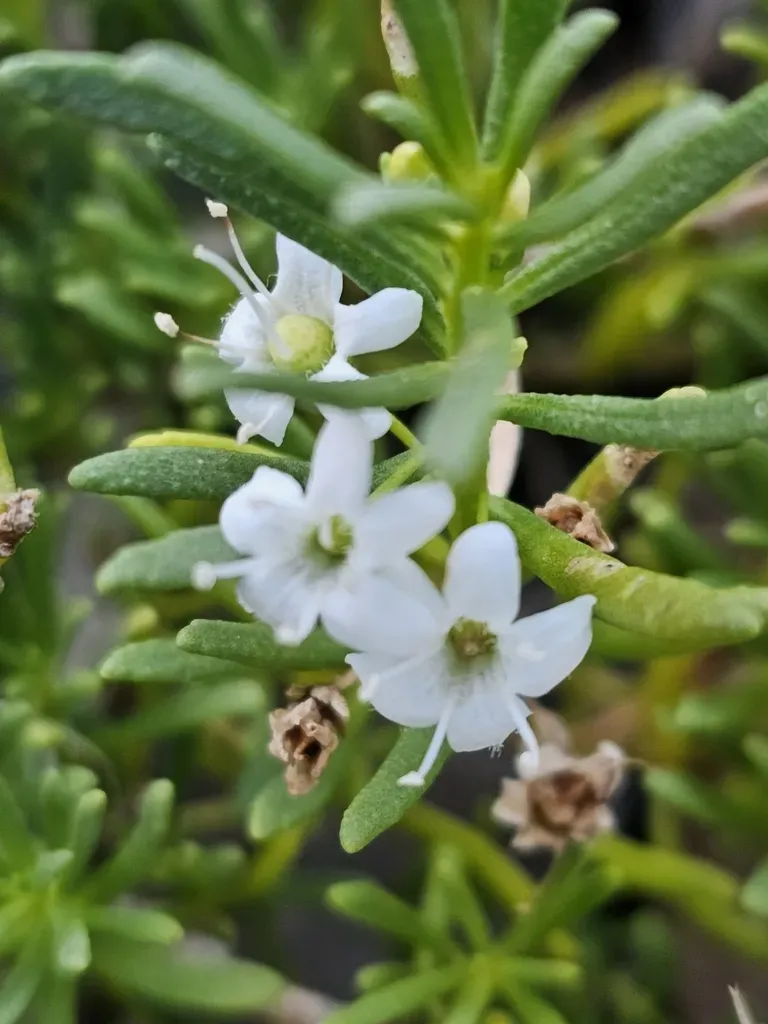 A low, spreading evergreen shrub with trailing stems and white star-shaped flowers, native to southern Australia.