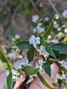 Myoporum petiolatum is a small to medium shrub native to Australia, characterized by dark green, shiny leaves and small white flowers.