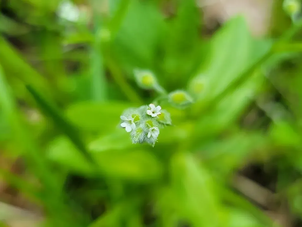 Myosotis macrosperma is a perennial herbaceous plant known for its white flowers and burr-like nutlets.