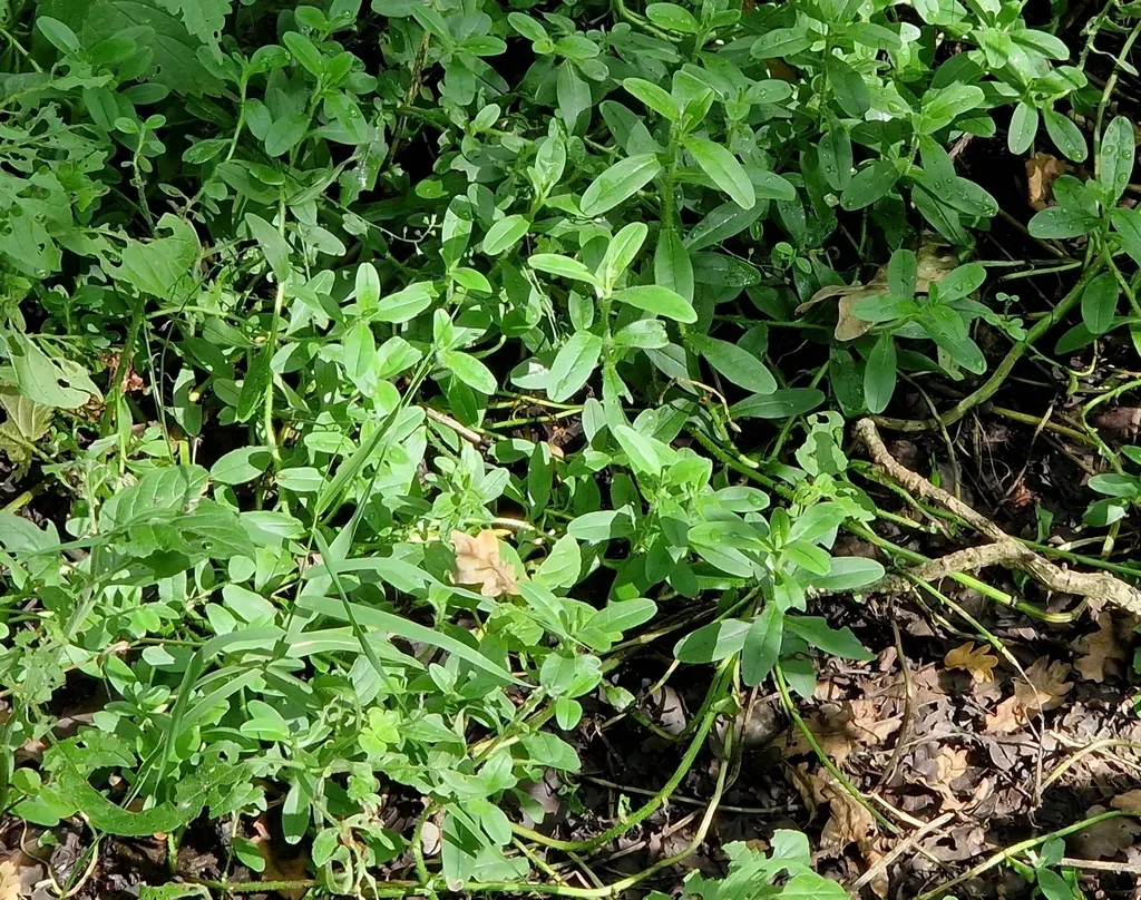 A perennial aquatic or semi-aquatic herbaceous plant with small blue flowers and yellow centers, commonly found along streams, ponds, and wet meadows.