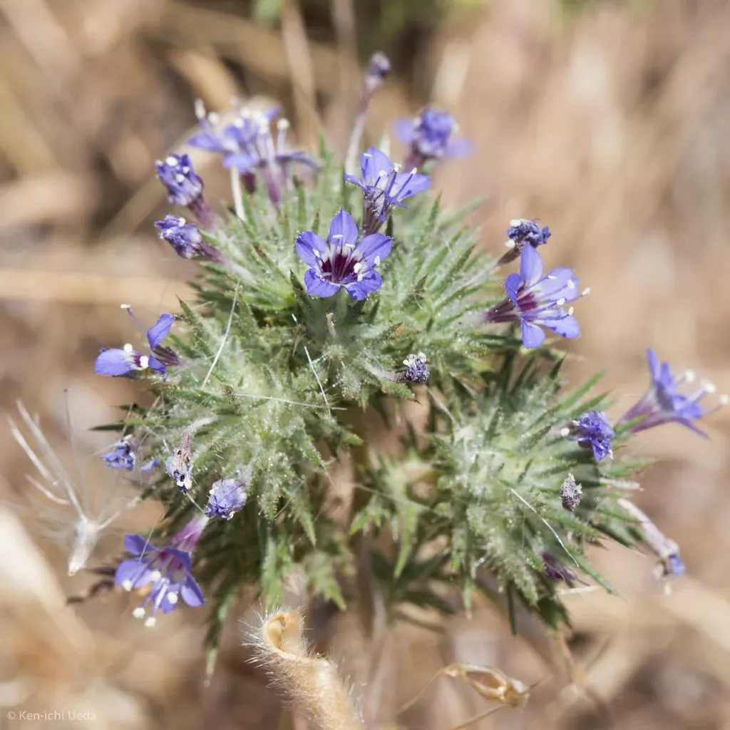 Navarretia pubescens is an annual herb native to California and Oregon, known for its hairy stems and pincushion-like flower clusters.