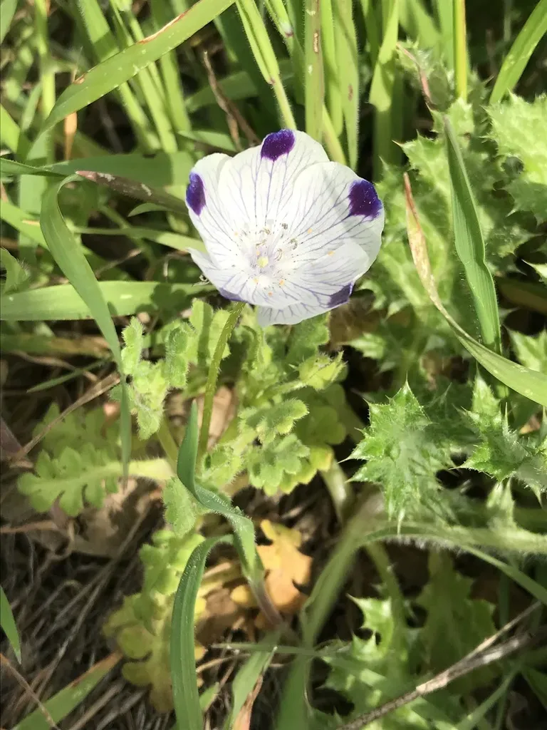 Nemophila maculata, commonly known as Five Spot, is an annual flowering plant native to California, recognized for its distinctive white bell-shaped flowers with five purple spots at the petal tips.