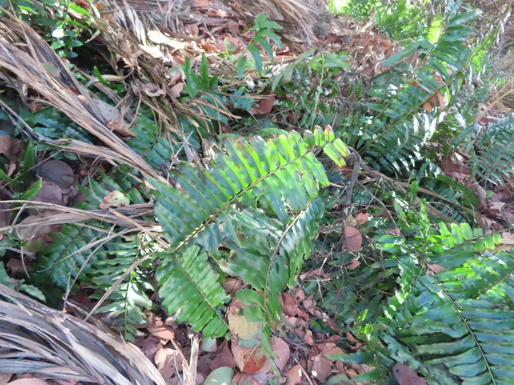 Giant Sword Fern (Nephrolepis Biserrata) is a perennial fern in the Nephrolepidaceae family with easy care difficulty. It requires high watering and partial shade or full shade or filtered_light light in USDA hardiness zones 9-11. This plant is safe for cats and dogs.