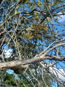 Golden Mistletoe (Notothixos Subaureus) is a perennial shrub in the Santalaceae family with moderate care difficulty. It requires moderate watering and full sun or partial shade light in USDA hardiness zones 9-11. This plant is safe for cats and dogs.