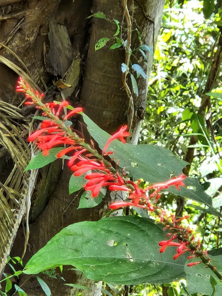 Odontonema tubaeforme, commonly known as Firespike, is a tall, evergreen shrub native to Central America, known for its striking red tubular flowers and glossy green leaves.