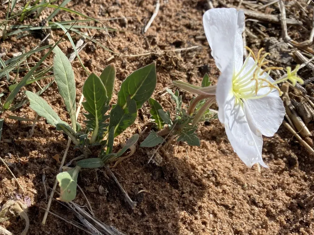 Prairie Evening-primrose (Oenothera Albicaulis) is a annual/biennial herb in the Onagraceae family with easy care difficulty. It requires low watering and full sun light in USDA hardiness zones 5-9. This plant is safe for cats and dogs.