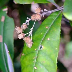 Olearia argophylla is a broadleaf evergreen shrub or tree known for its silvery foliage and white summer flowers.
