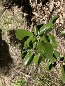 A bushy shrub or small tree with leathery, dark green glossy toothed leaves that are rusty underneath.