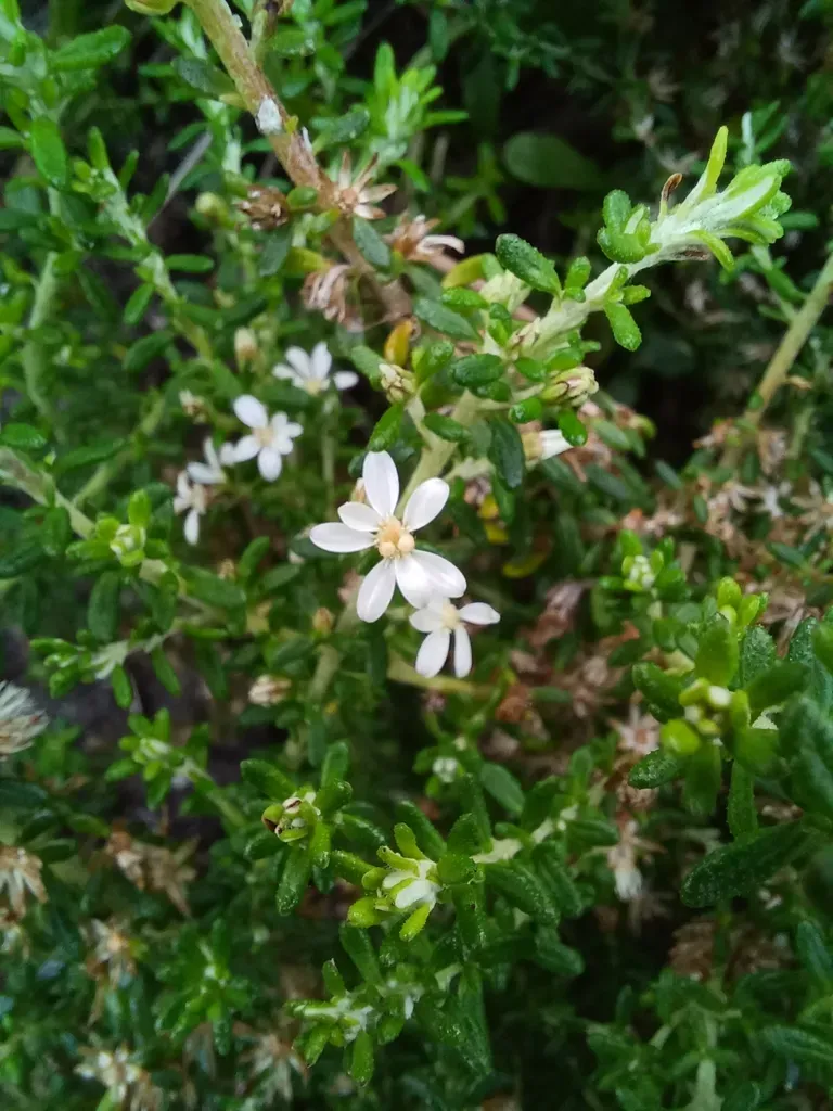 Twiggy Daisy-bush (Olearia Ramulosa) is a perennial shrub in the Asteraceae family with easy care difficulty. It requires moderate watering and full sun or partial shade light in USDA hardiness zones 9-11. This plant is safe for cats and dogs.
