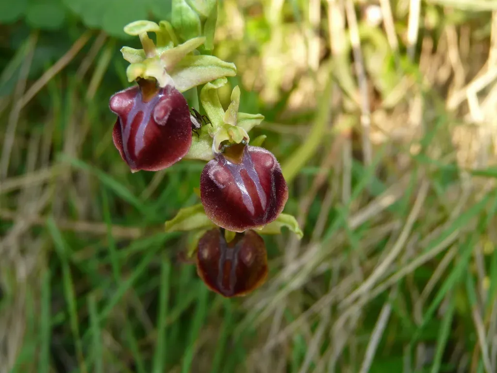 Ophrys mammosa is a terrestrial orchid known for its robust stature and distinctive flowers that mimic the appearance of female bees to attract pollinators.