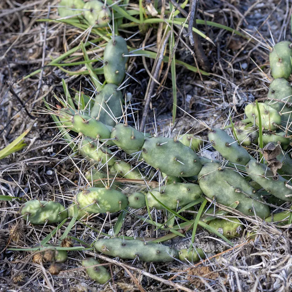 Dune Prickly-pear (Opuntia Drummondii) is a perennial cactus in the Cactaceae family with easy care difficulty. It requires drought-tolerant watering and full sun light in USDA hardiness zones 8-11. This plant is toxic to cats and dogs — keep it out of reach of pets.