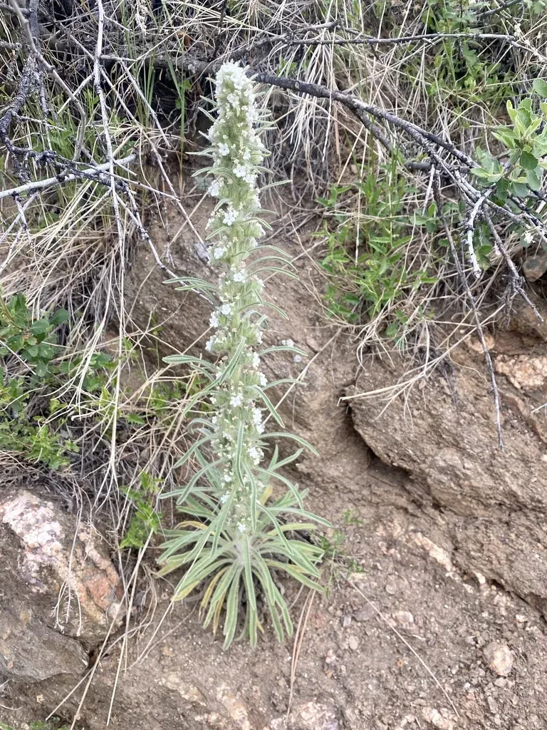 Miner's Candle (Oreocarya Virgata) is a biennial herb in the Boraginaceae family with easy care difficulty. It requires low watering and full sun or partial shade light in USDA hardiness zones 4-8. This plant is safe for cats and dogs.