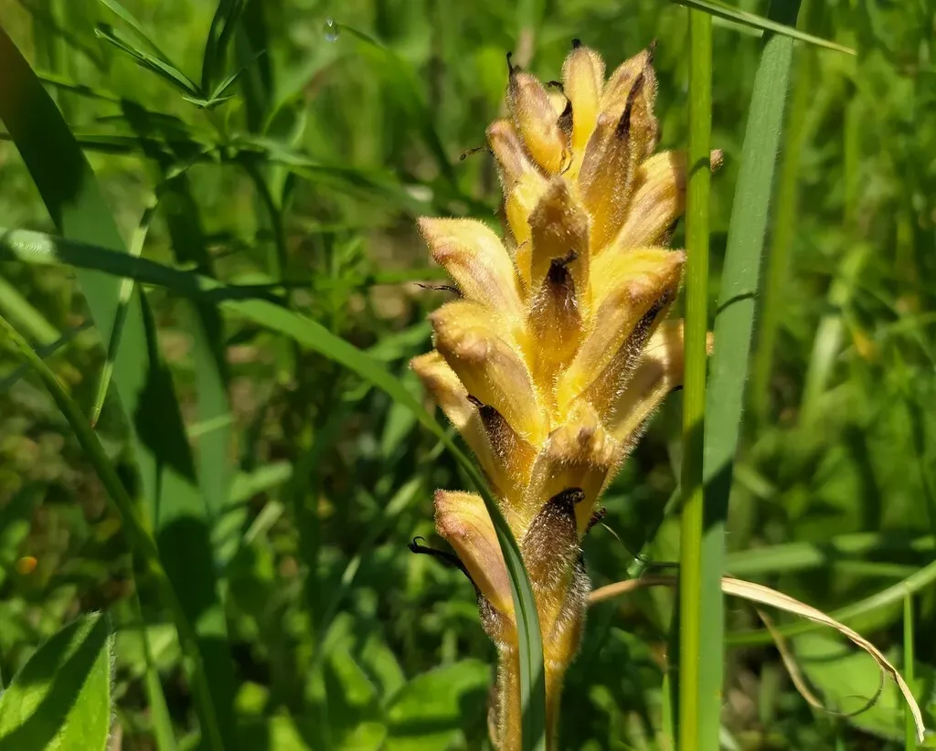 Orobanche lutea is a holoparasitic plant characterized by its yellow to yellowish-brown flowers growing in spike-like clusters. It lacks chlorophyll and depends entirely on host plants for nutrients.
