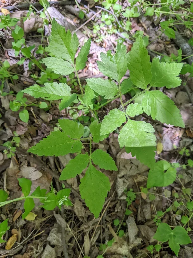 Osmorhiza claytonii is a perennial herb native to North American mesic forests, known for its white flowers arranged in umbels and its aromatic roots.
