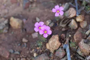 Oxalis glabra is a perennial tuberous plant with clover-like leaves and deep pink flowers.