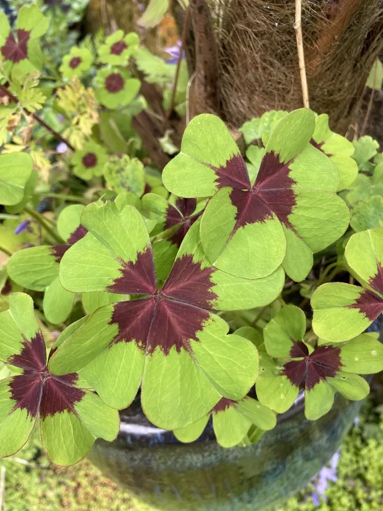 A bulbous perennial forming a lush mound of rich green leaves composed of four heart-shaped leaflets, each with a dark purplish blotch at its base.