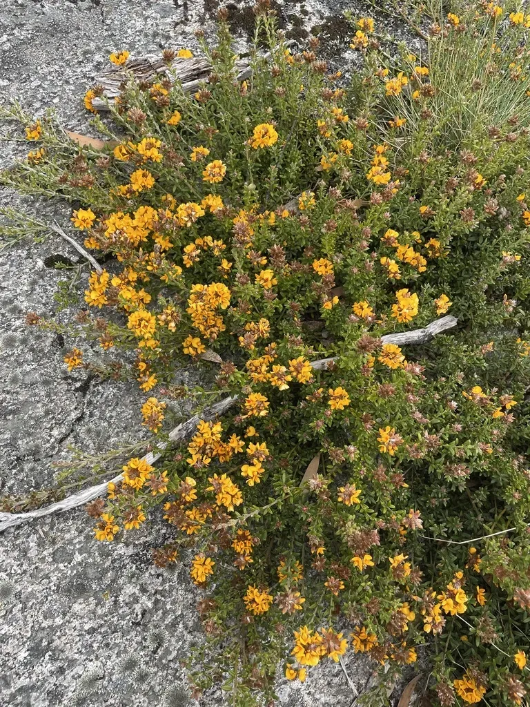 Oxylobium ellipticum is a much-branched shrub with golden yellow pea flowers, native to south-eastern Australia.