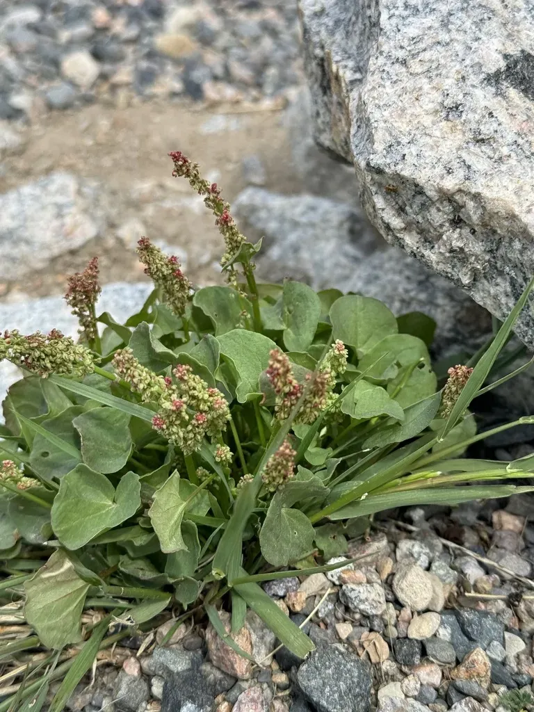 Oxyria digyna is a perennial herbaceous plant native to arctic and alpine regions, known for its distinctive red stems and kidney-shaped leaves.