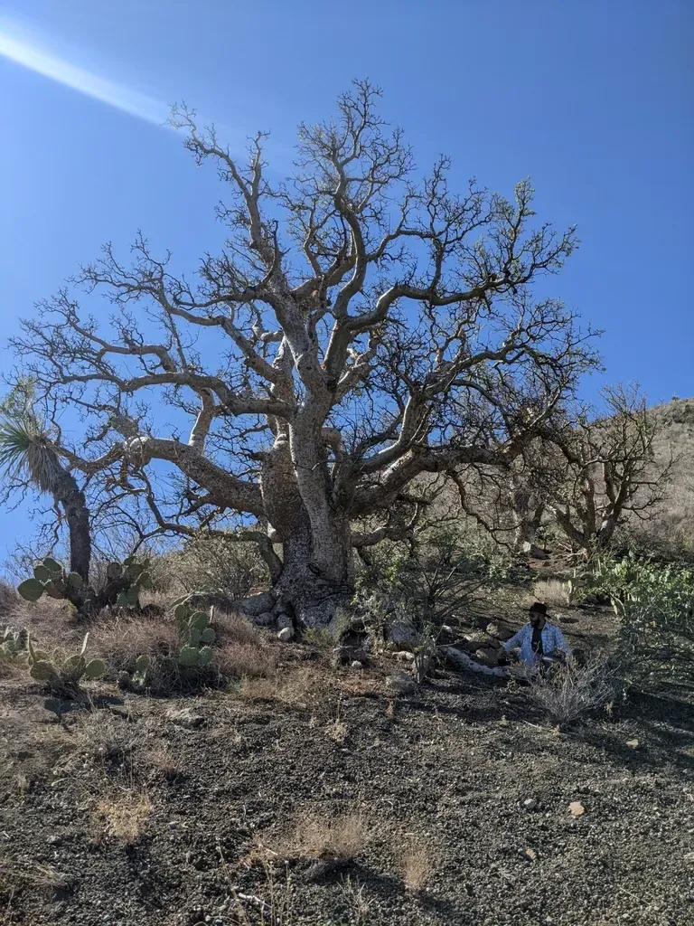 A sarcocaulescent tree or shrub with gnarled growth, succulent nature, and distinctive exfoliating bark resembling elephant skin.