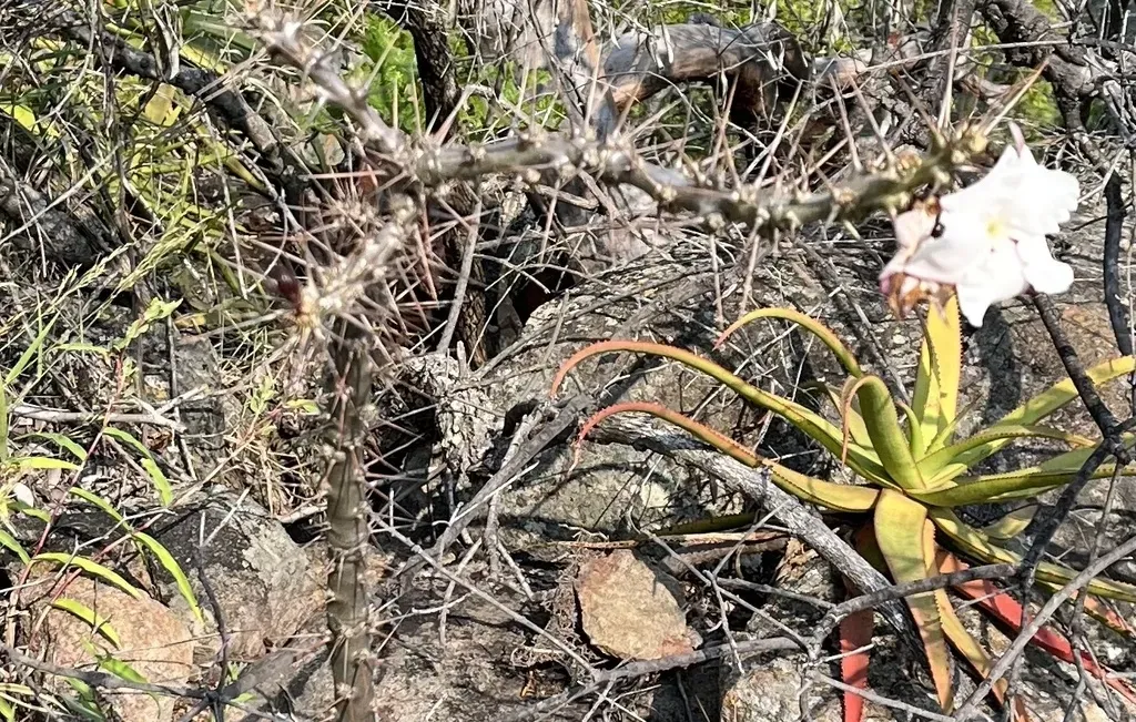 Pachypodium saundersii is a small, shrubby succulent plant native to southern Africa, characterized by its thorny stems and shiny dark green leaves.