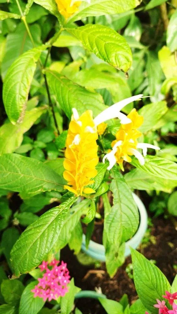 Pachystachys lutea is a tropical evergreen shrub known for its bright yellow bracts and white flowers.