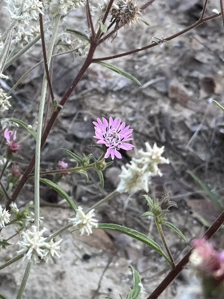Palafoxia rosea is a drought-tolerant annual herb known for its pink to purple solitary flowers on slender stalks.