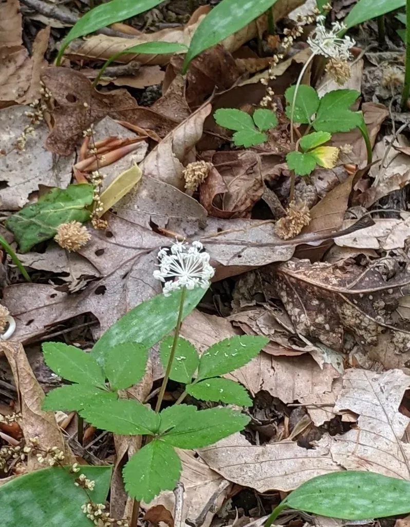 Panax trifolius, commonly known as dwarf ginseng, is a small perennial herb native to North America, characterized by its three compound leaves and small white flowers.