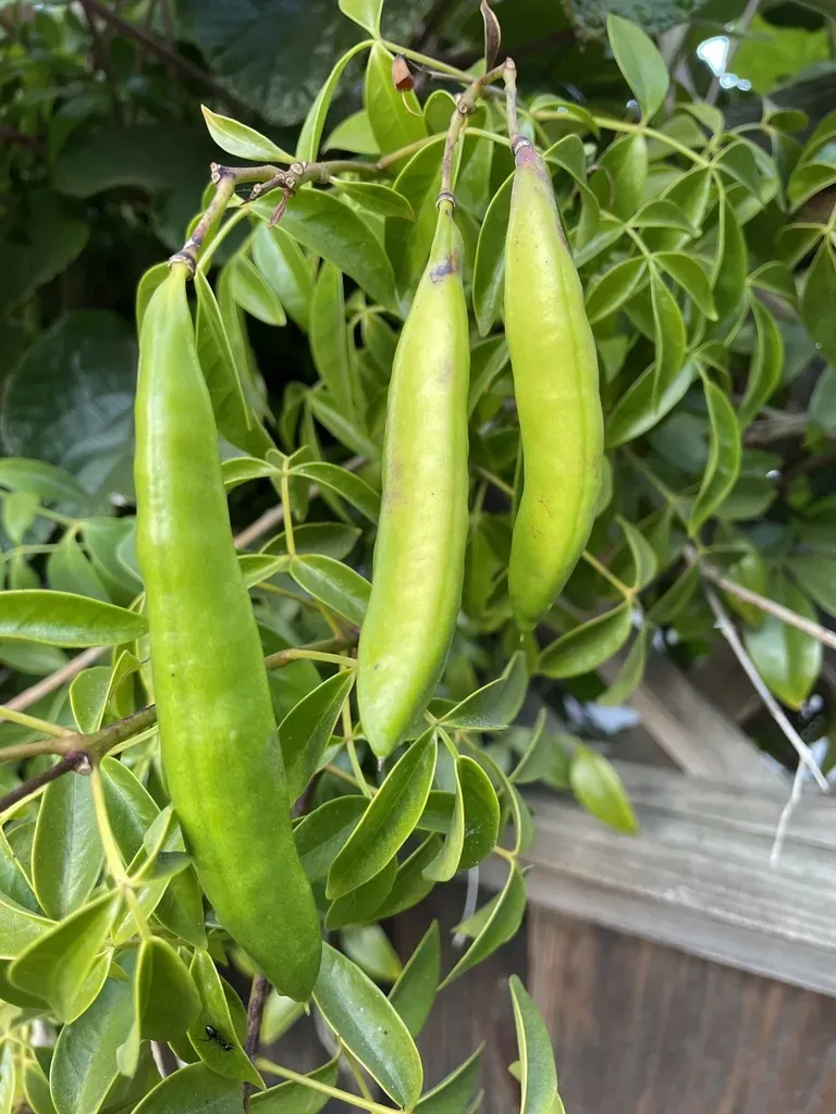 Pandorea jasminoides is an evergreen woody climber known for its glossy dark green pinnate leaves and funnel-shaped flowers that range in color from white to pink with darker throats.
