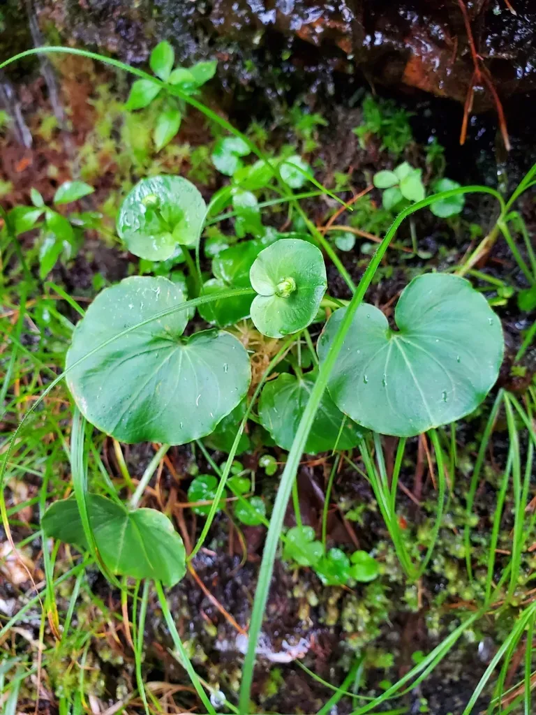 Parnassia asarifolia is a perennial herbaceous plant native to acidic bogs and seeps, recognized by its single kidney-shaped leaf and distinctive white flowers with green veins.