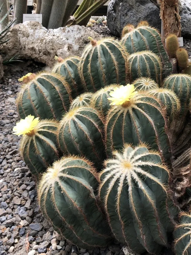 Parodia magnifica is a globose to cylindrical bluish-green cactus with straight ribs and golden yellow spines, native to southern Brazil.