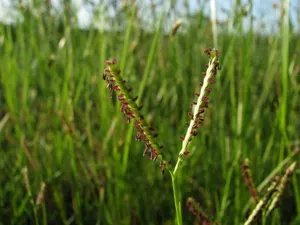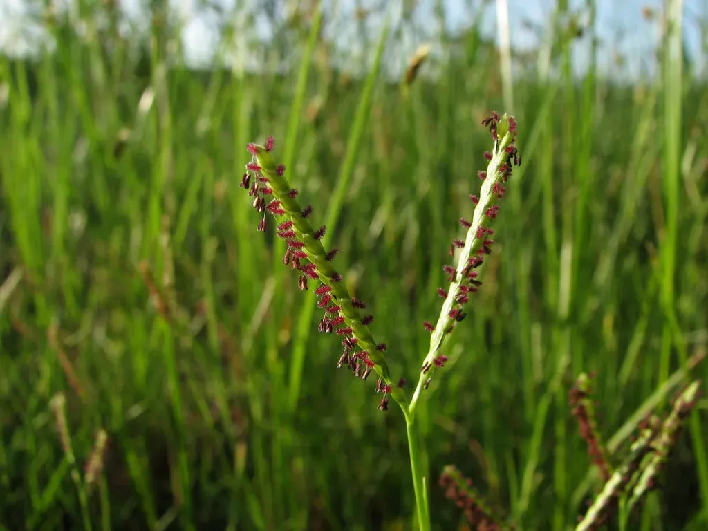 Paspalum distichum is a perennial, rhizomatous grass commonly found in wet areas, known for its mat-forming growth and tolerance to waterlogged environments.