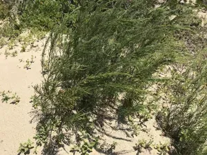 Dune Gonna (Passerina Rigida) is a perennial shrub in the Thymelaeaceae family with easy care difficulty. It requires low to medium watering and full sun or partial shade light in USDA hardiness zones 9-11. This plant is safe for cats and dogs.
