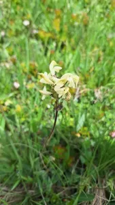 Long-beaked Yellow Lousewort (Pedicularis Tuberosa) is a perennial herb in the Orobanchaceae family with moderate care difficulty. It requires moderate watering and partial shade or dappled_shade light in USDA hardiness zones 4-7. This plant is safe for cats and dogs.