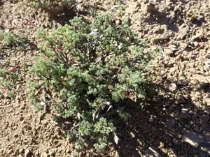 Pelargonium abrotanifolium is an erect, much branched shrublet with feathery, aromatic grey-green leaves and white flowers with purple veins.