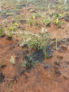 Pelargonium dolomiticum is a tuberous geophyte native to South Africa, characterized by its greyish appearance due to short hairs and glands covering the plant.
