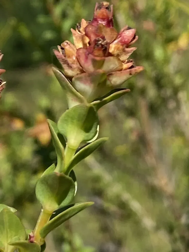 Penaea cneorum is a shrub known for its leathery foliage and compact spikes of small yellow flowers resting on greenish-yellow bracts.