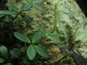 A low-growing perennial herb with creeping stems and small, semi-succulent round leaves, often forming dense mats.