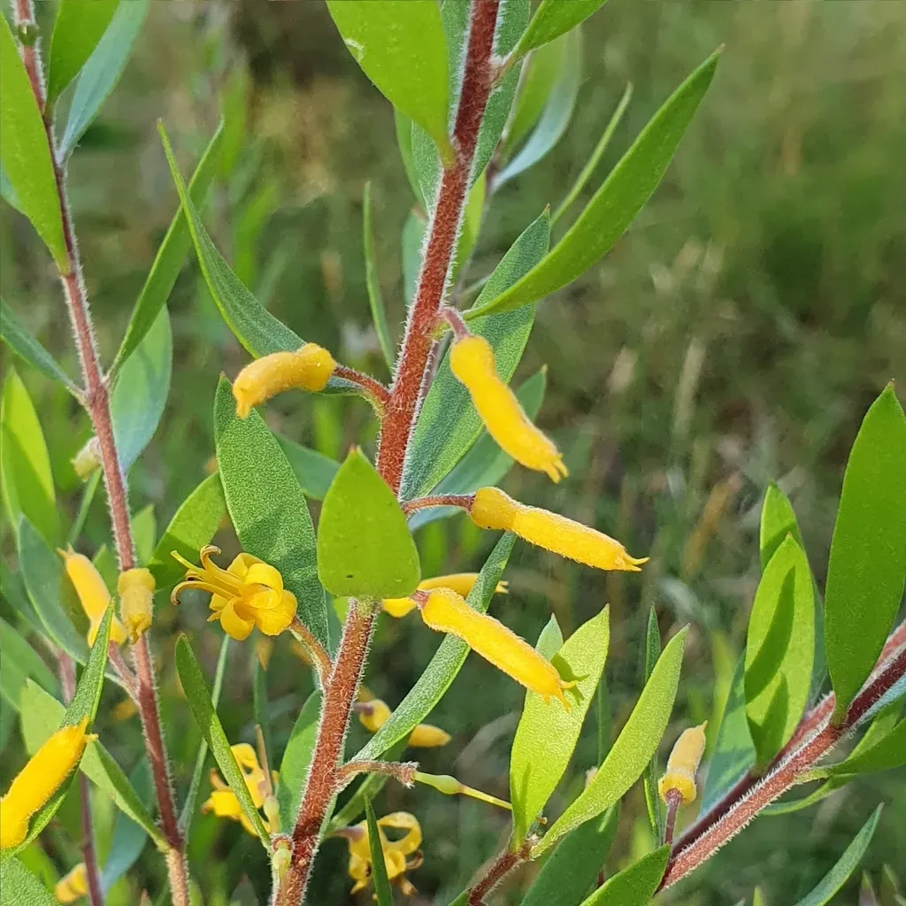 Persoonia lanceolata is an upright spreading shrub native to New South Wales, Australia, growing up to 3 meters tall and 2 meters wide, with lance-shaped leaves and yellow flowers.