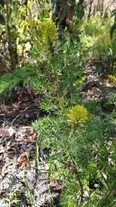 Petrophile canescens is an erect shrub native to eastern Australia, growing up to 2 meters tall with blue-green deeply divided foliage and creamy-yellow flowers.