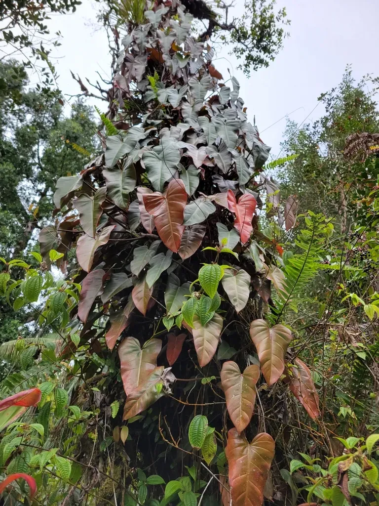 A robust evergreen climbing aroid with red stems and glossy, heart-shaped leaves, prized for its ornamental foliage.