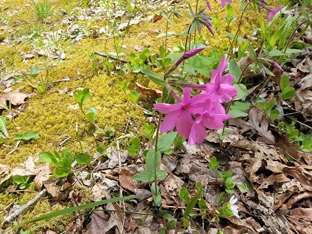 Phlox stolonifera is a low-growing, mat-forming perennial native to the Appalachian Mountains, known for its vibrant spring flowers and evergreen foliage.