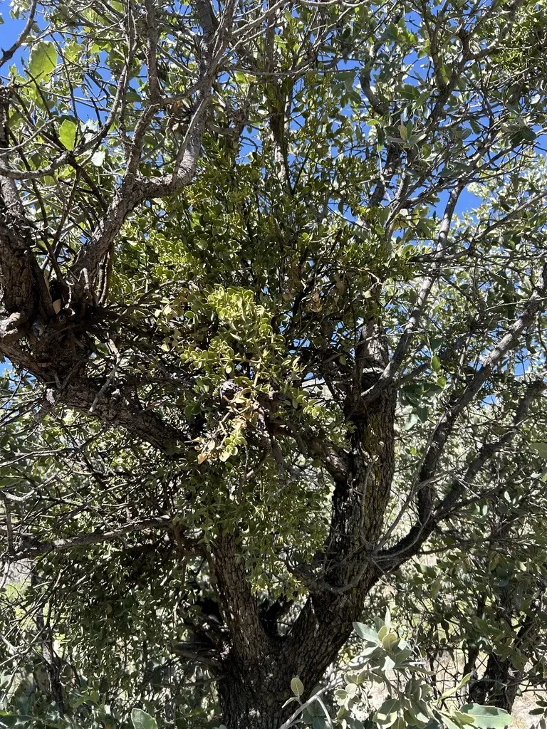 Phoradendron villosum is a parasitic shrub native to California and western North America, commonly found on oak trees and other woody shrubs.