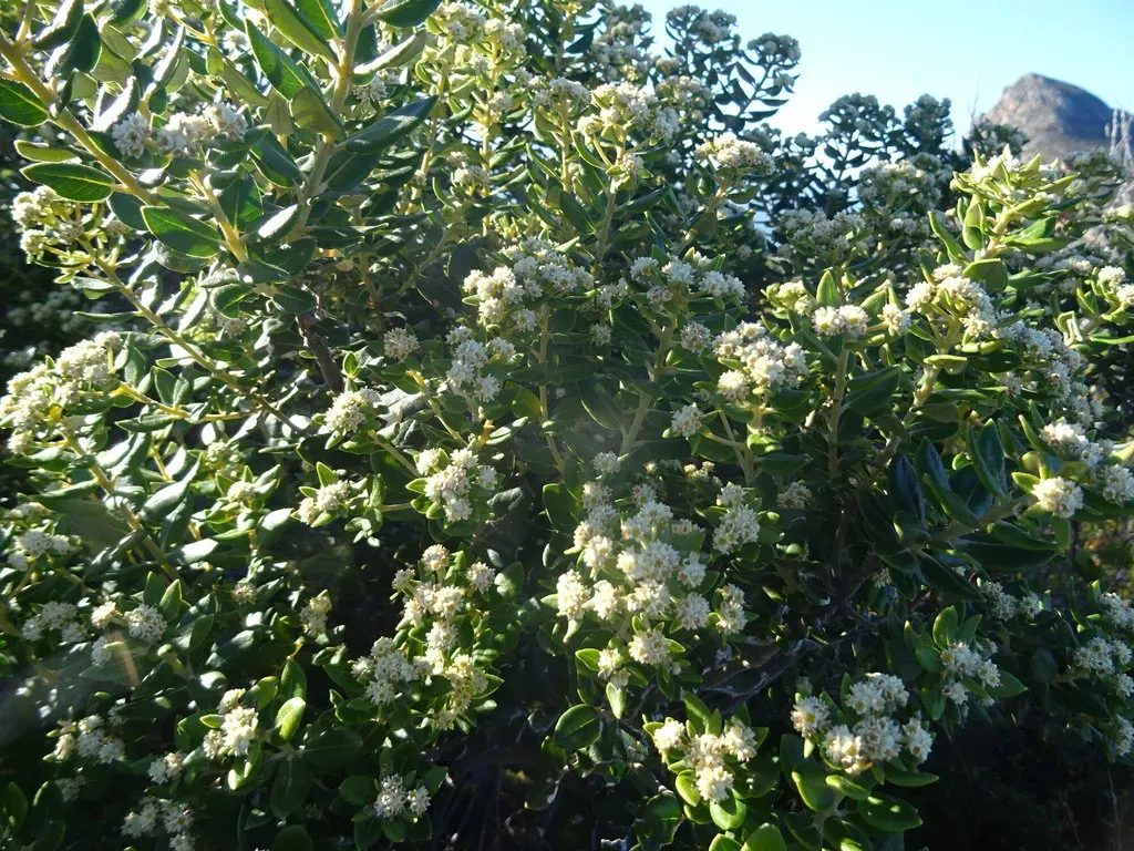 Phylica buxifolia is a dense shrub or small tree native to the southwestern Cape Province of South Africa, growing up to 4 meters tall with small, leathery leaves and hairy twigs.