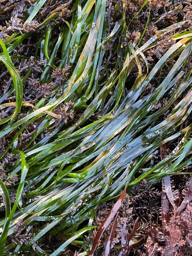 Phyllospadix scouleri is a perennial marine flowering plant native to the western North American coastline, characterized by flat, wide leaf blades and a rhizomatous base.