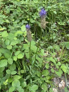 Phyteuma nigrum, commonly known as Black Rampion, is a perennial alpine plant with spiky deep violet flowers and lanceolate green leaves forming a basal rosette.